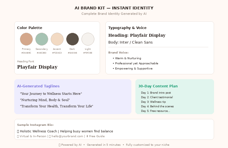 AI-generated brand identity: colors, fonts, voice, content strategy & more
